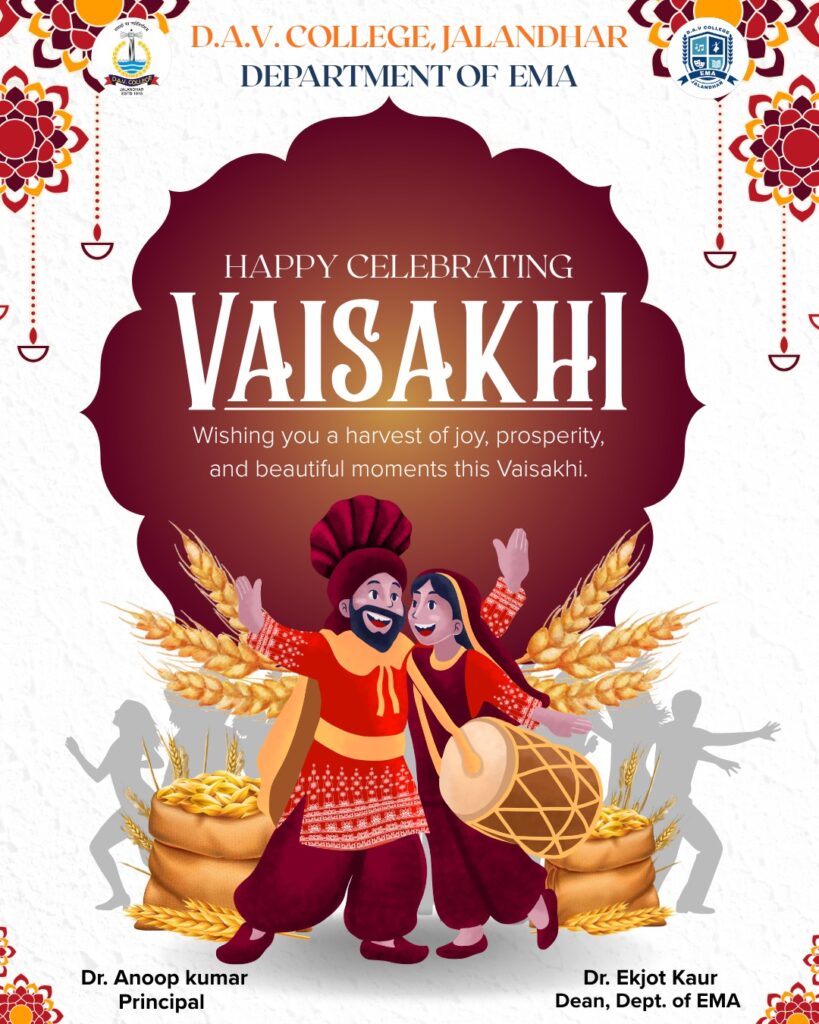 जालंधर: शहर के डी.ए.वी. कॉलेज के ई.एम.ए. विभाग द्वारा बैसाखी पर्व को विविध रंगारंग सांस्कृतिक कार्यक्रमों के साथ अत्यंत उत्साह पूर्वक मनाया गया। कॉलेज के एक्स्ट्रा म्यूरल एक्टिविटीज़ (ई.एम.ए.) विभाग ने परिसर में इस फसल उत्सव का आयोजन बड़े हर्षोल्लास के साथ किया। इस अवसर पर प्राचार्य डॉ. अनूप कुमार ने मुख्य अतिथि के रूप में कार्यक्रम की शोभा बढ़ाई।