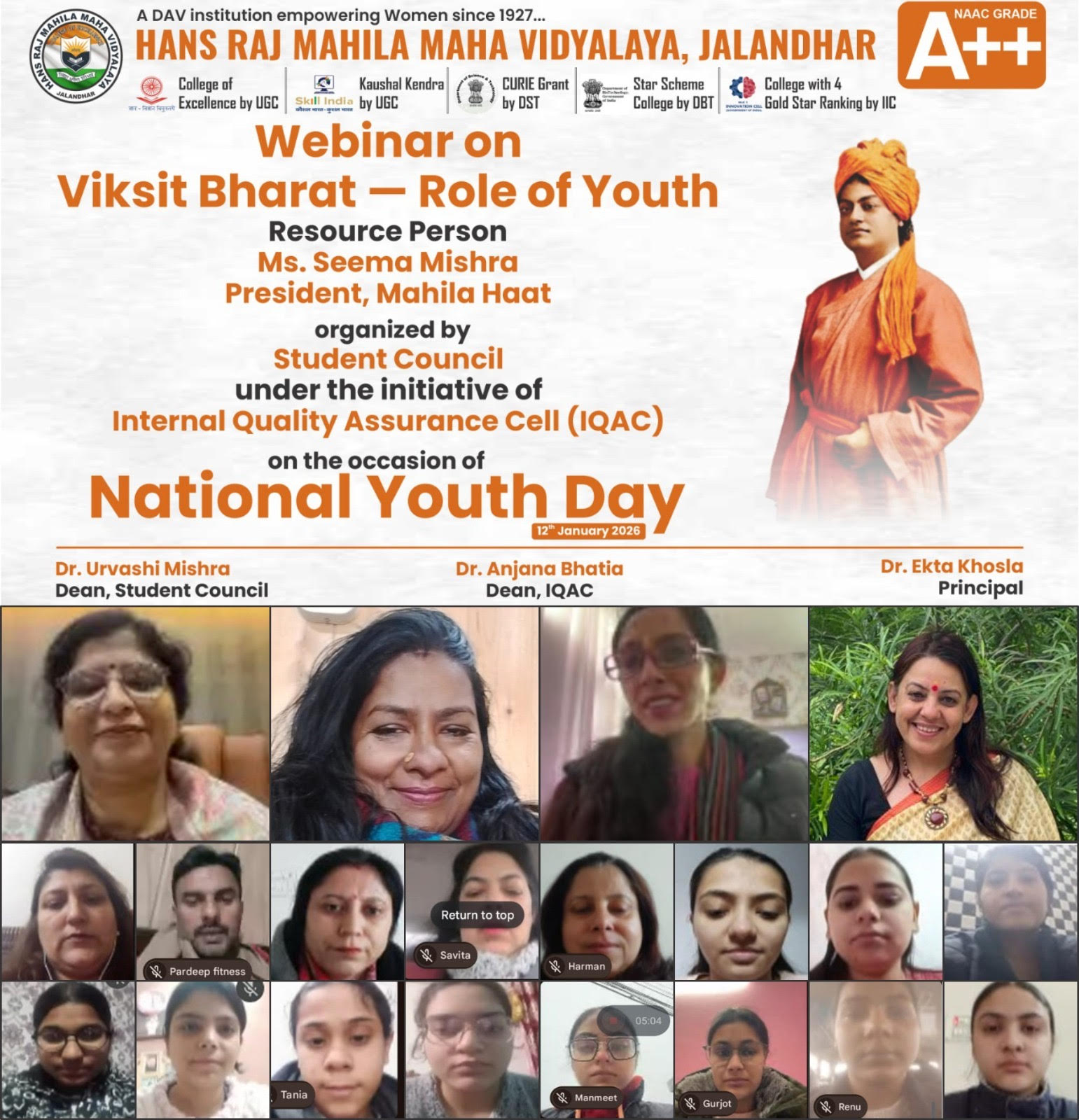 जालंधर: शहर के हंसराज महिला महाविद्यालय की छात्र परिषद ने आईक्यूएसी के सहयोग से तथा प्राचार्या डॉ. (श्रीमती) एकता खोसला के मार्गदर्शन में स्वामी विवेकानंद जी की जयंती के अवसर पर राष्ट्रीय युवा दिवस मनाया। इस अवसर पर ‘विकसित भारत युवाओं की भूमिका’ विषय पर एक वेबिनार का आयोजन किया गया। कार्यक्रम की मुख्य वक्ता सीमा मिश्रा, अध्यक्ष, महिला हाट सोसायटी रहीं, जो महिला और युवा सशक्तिकरण के क्षेत्र में कार्य कर रही हैं। कार्यक्रम की शुरुआत दीप प्रज्वलन से हुई, इसके बाद डीएवी गान प्रस्तुत किया गया। छात्र परिषद की डीन डॉ. उर्वशी मिश्रा ने सभी अतिथियों का स्वागत किया और राष्ट्रीय युवा दिवस के महत्व पर प्रकाश डाला।