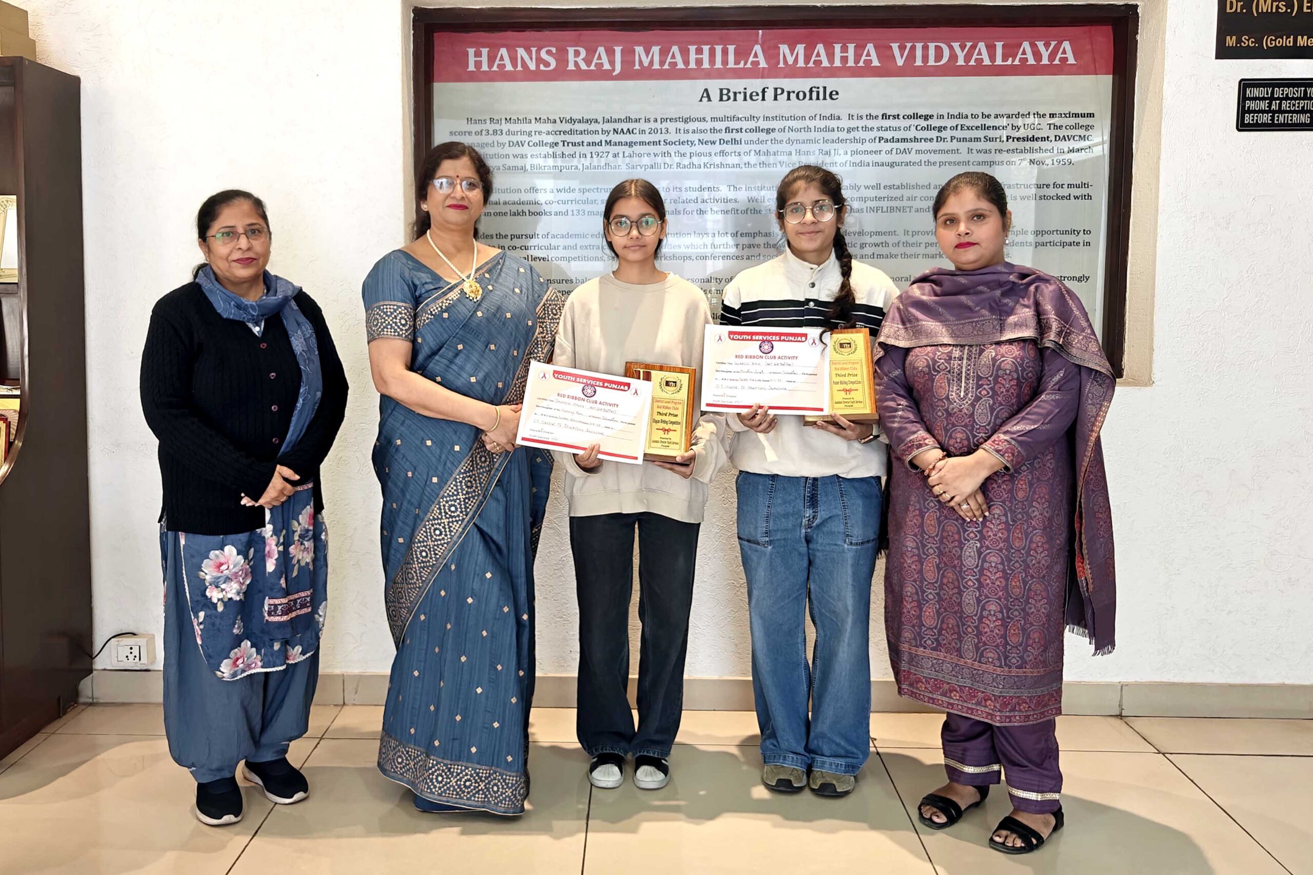 जालंधर: शहर के हंसराज महिला महाविद्यालय के रेड रिबन क्लब व फाइन आर्ट्स विभाग की छात्राओं ने पंजाब स्टेट एड्स कंट्रोल सोसाइटी एवं यूथ वेलफेयर विभाग जालंधर द्वारा आयोजित राज्य स्तरीय प्रतियोगिता में इनाम जीतकर कॉलेज का नाम रोशन किया है। वहां रेड रिबन क्लब की इंचार्ज डॉ. दीपाली प्रतियोगिता में छात्राओं के साथ गईं।