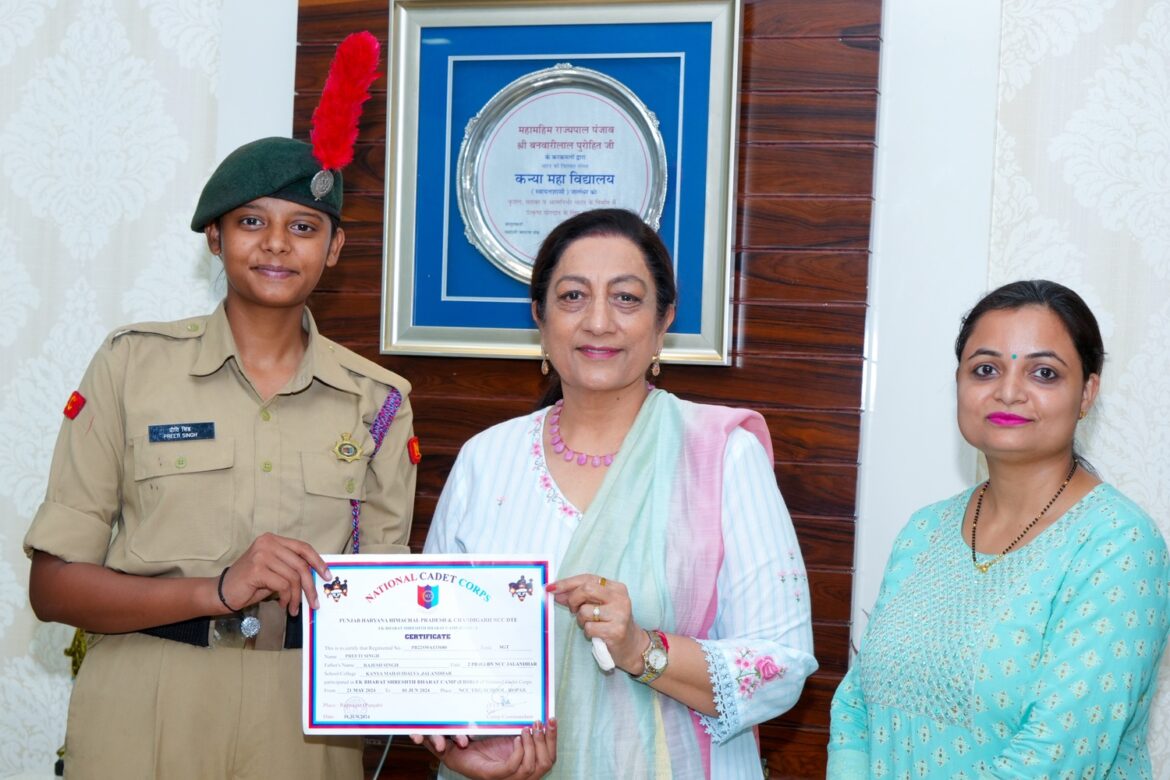 जालंधर: शहर के कन्या महा विद्यालय (स्वायत्त) की एनसीसी कैडेट अमरजीत कौर को एक मोटिवेशनल सेमिनार के दौरान सराहना पुरस्कार से सम्मानित किया गया। वह जालंधर समूह की एकमात्र कैडेट थीं, जो इस सैमीनार का हिस्सा बनीं। इस सैमीनार का आयोजन एनसीसी निदेशालय पंजाब, हरियाणा, हिमाचल प्रदेश और चंडीगढ़ द्वारा किया गया था। प्राचार्य प्रोफेसर डॉ. अतीमा शर्मा द्विवेदी ने कहा कि यह मान्यता हमारे छात्रों की असाधारण प्रतिभा और समर्पण को रेखांकित करती है और भविष्य के नेताओं को पोषित करने की के.एम.वी. की प्रतिबद्धता को दर्शाती है।
